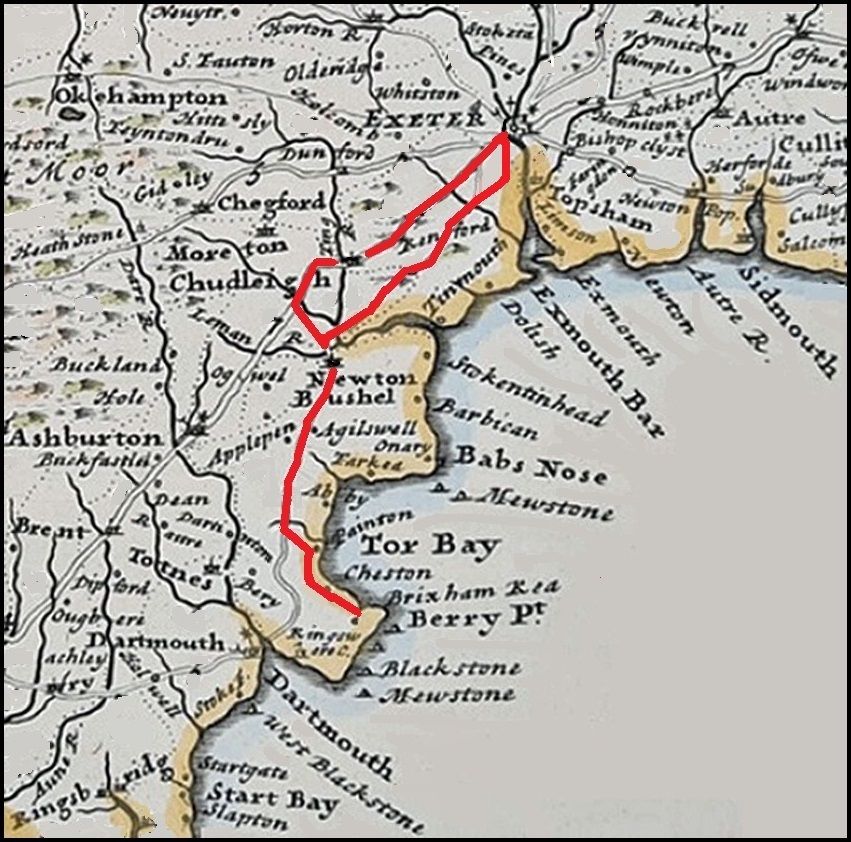 Map Showing the Route of William's Army (in Red) from Torbay to Exeter