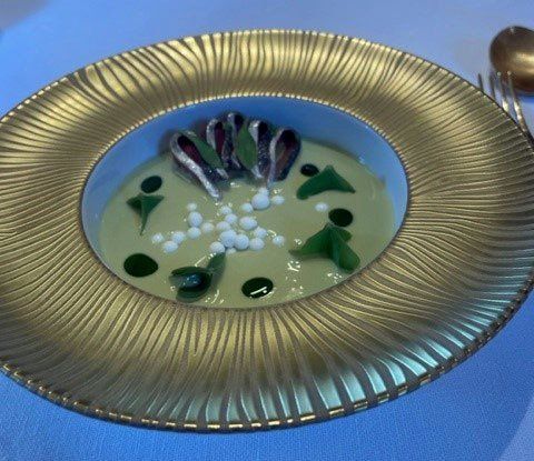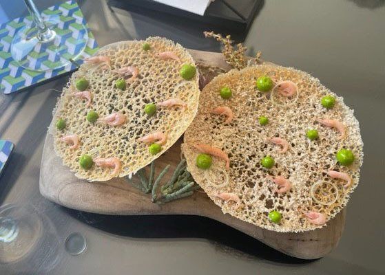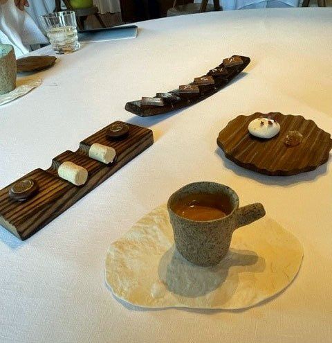 We took this gastronomic trip to celebrate the fact that we can both travel again, after a tough year when Geoff needed surgery, chemotherapy and radiotherapy. And what a place to celebrate! The restaurant is beautiful, and the excellent service was pure theatre. But the food is the star of the show. Dozens of small plates were beautifully showcased using marine ingredients: sea snails, sea urchins, kelp, seaweed and sea vegetables. Vinny is not an adventurous eater of unusual sea products, but for both of us, every bite was utterly gorgeous. Everything we ate was stunning. Memorable courses include the tapas of ‘ham’ and ‘cheese’ – all made out of sea produce.