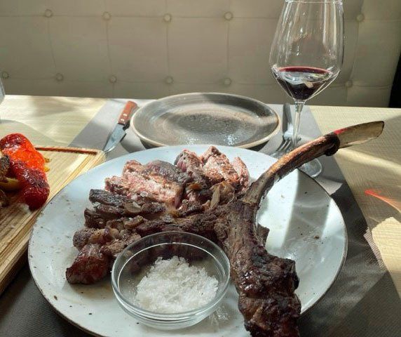 On our final day we found the most perfect txuleta steak at Tximis Tarri steakhouse. Their huge rib steaks come from older cattle, aged between eight and eighteen years. The meat, almost a maroon colour and edged with distinctive yellow fat, is renowned for its depth of flavour and marbling. It’s usually cooked a la plancha and is so big that sharing is essential. It was served with simple grilled red peppers, and oven roasted potatoes, a fabulous end to our food and wine tour of Spain.