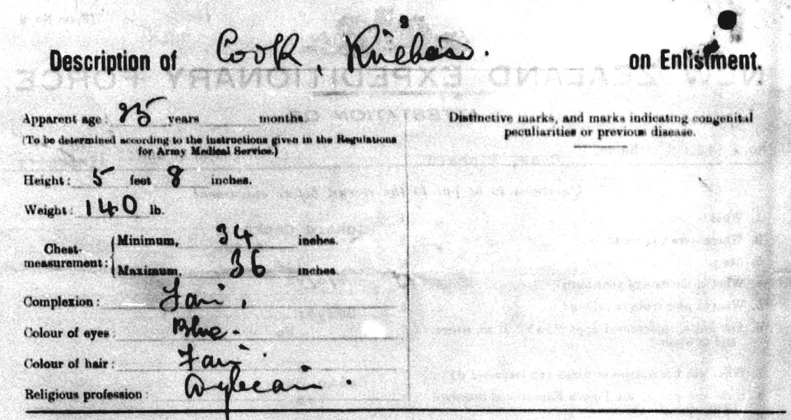 Part of Richard Cook's Army Medical Record on Enlistment in New Zealand on 23 August 1916