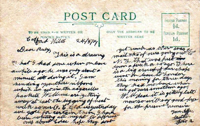 Richard Cook enlisted in New Zealand on 23 August 1916. His troopship left Wellington on 30 December and arrived in Devonport in England on 3 March 1917. He was sent to Codford on Salisbury Plain for training. From Codford Richard Cook sent a postcard and drawing of himself to his adopted sister Ruby (1904-1995) two weeks before the attack on Messines Ridge. Richard Cook writes on the postcard that they were informed by their commanding officer that "for certain" they were "getting away at last" in a few days, thus hinting at the big battle to come.