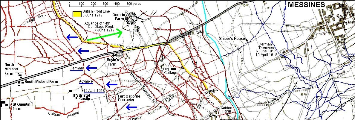In the Battle of Messines Ridge of 7 June 1917 Richard Cook's 14th Company was ordered to attack roughly eastwards just north of the Wulverghem-Messines road. This mean that they would have gone over the top just north-west of Boyle's Farm. They reached the Messines-Wytschaete road near Swayne's Farm (see above map). [3]