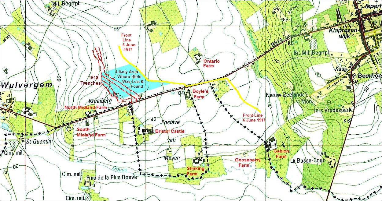 On 12 April 1918 the Germans advanced as far west and beyond the blue arrows, but were repulsed by Herbert Hodgson’s battalion just east of North Midland Farm. After he went over the top in the counter-attack, Hodgson moved further eastwards on the north side of the Wulverghem-Messines road. Either the Bible was lost by Richard Cook while he was close to that farm (probably during heavy shelling) , or Hodgson reached as far as the old 6 June 1917 front line, and this is where the Bible was lost by Cook and found by Hodgson.