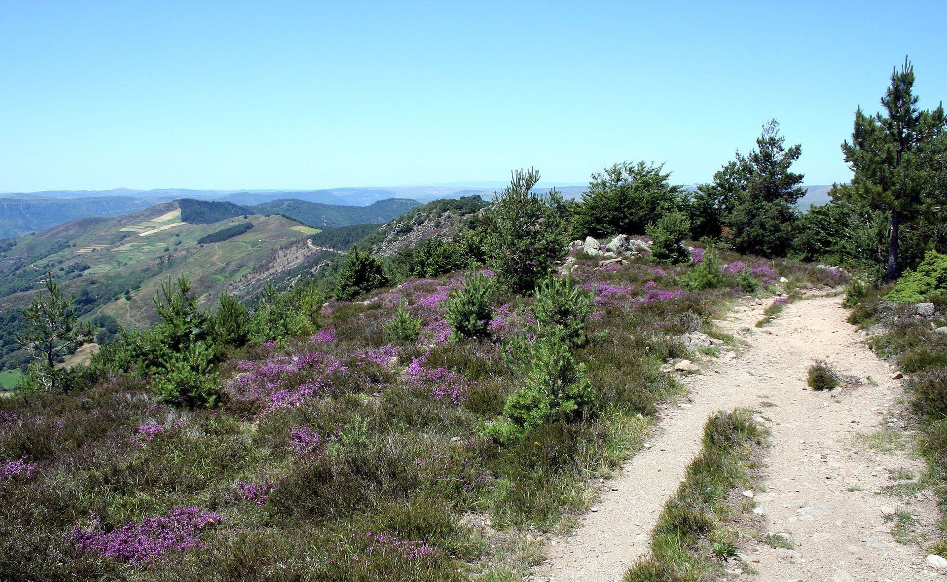 Near the top of the ridge the GR70 emerges into open country and the summit of the Signal du Bouges is reached at 1421 metres. At times the views were magnificent. Added to this were carpets of flowering heather capping much of the ridge. I overtook two French couples taking the same route and met a very short man with a dog coming the other way. It was the hottest day I had experienced on my whole journey, and before the end I ran out of water. It was a long and tiring stretch, but the most spectacular of my whole journey. Abigail had missed this treat.